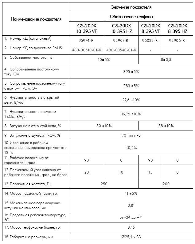 Геофон GS-20DX производится в двух модификациях с собственной частотой: 8 и 10 Гц, в вертикальном и горизонтальном вариантах.